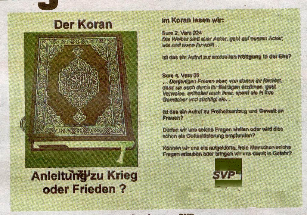 Noch gerade ist es legitim Wasser auf die eigene Mühle zu schütten. Dass dabei oft der Pfad der Tugend verlassen wird wissen wir auch. Unzimperliches Umgehen mit dem politischen Gegner hat Tradition in der westlichen Kultur. Es gehört zu unserem Demokratieverständnis damit umzugehen. Statements wie immer sie auch einher kommen, helfen uns zu lesen wie die jeweilige Gruppierung denkt. Soviel zur offenen Gesellschaft. Zu Sure 2 Vers 223. Egal in welchem Zusammenhang dieser Satz steht und man gehe davon aus, dass er lediglich zum heiligen Kinderzeugen für die eigene Sache aufruft, er ist aber ein verbales Ärgernis. Er impliziert wie die Karten zwischen Mann und Frau in diesem Kulturkreis gemischt sind. Der Mann bestimmt wann was zu geschehen hat. Gerade für geistig Minderbemittelte ist diese Sure fatal missverständlich und sie wäre es auch, wenn sie im neuen Testament stünde. Im weiteren ist der Begriff Weiber etwas veraltet und Acker gelinde gesagt eine Riesenschweinerei. Aber wir könnten es ja im Zuge von Multikulti mit der Desemantisierung des Wortes Frau versuchen. Hallo Acker gehn wir sähen! Dass die SVP in Sachen Kirchenkritik und Feminismus der SP den Rang abläuft ist neu. Hierzulande pflügt doch die SVP die Äcker. Herrn Ismail Amin würde ich dringend raten, den Koran ins 21th Jahrhundert übersetzen zu lassen. Die Sure würde dann ungefähr so lauten: Liebet und vermehret euch! (wann und wo immer ihr beide gerade Lust dazu habt). Oder fehlt da etwas aus dem weiteren Zusammenhang? |